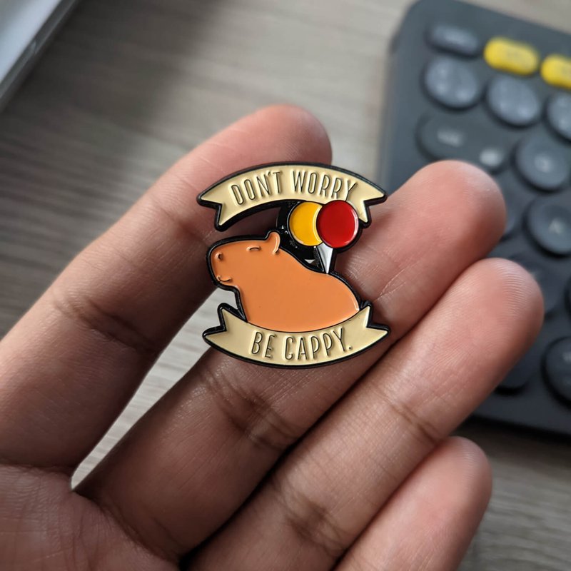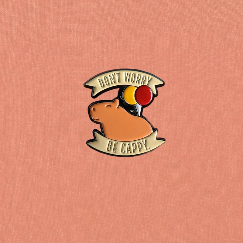 Añade un toque de alegría a tu colección con este adorable pin metálico 🌟. Presenta un capibara con globos y la frase "Don't worry, be cappy" 🎈✨. Perfecto para recordar que la felicidad está en las pequeñas cosas.