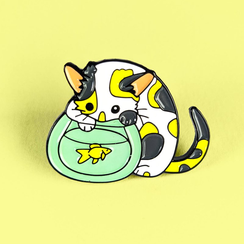 Lleva este pin que muestra a un michi jugando con su pequeño amigo ¿O su próximo almuerzo?.