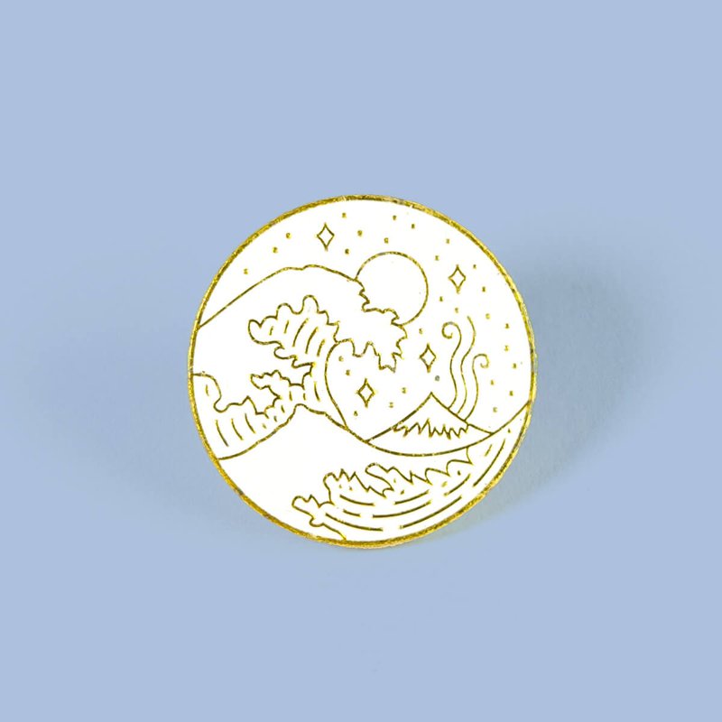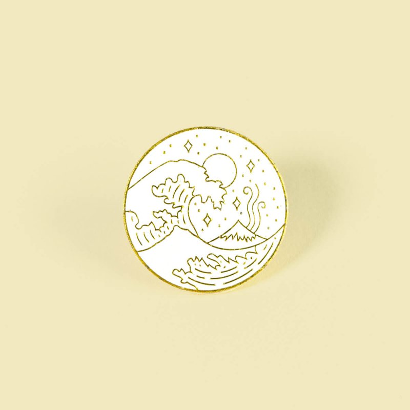 Pin metálico con forma circular y motivos de: el mar, olas, una montaña, el viento, y el sol (o acaso es la luna?).