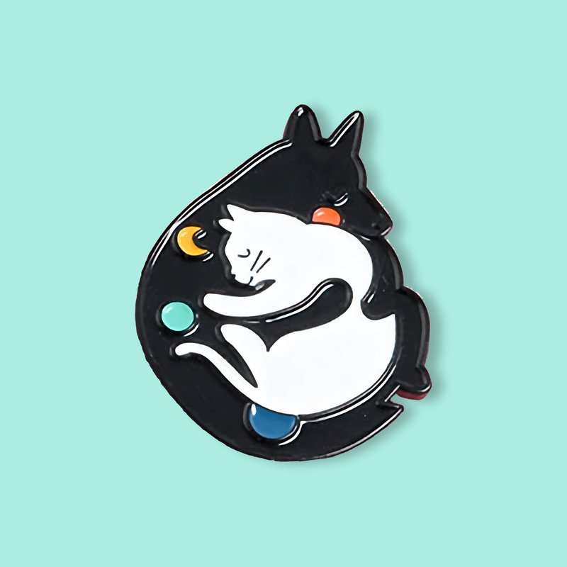 Este pin muestra un perro de color negro con motivos de la luna y planetas coloridos abrazando un gatito blanco.