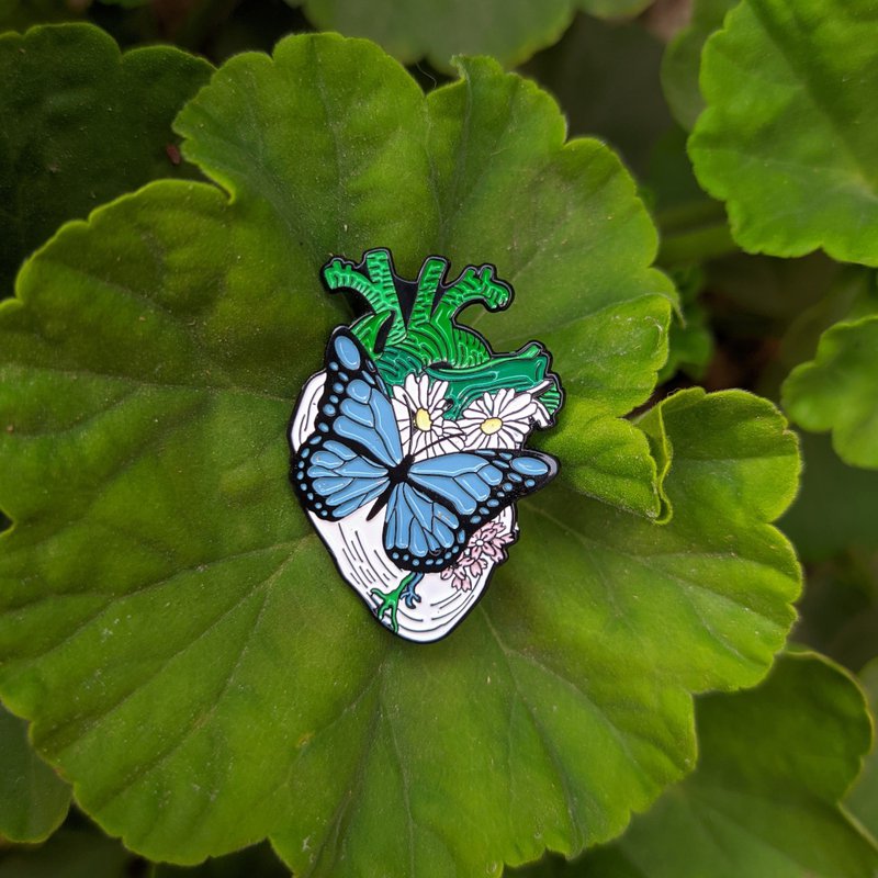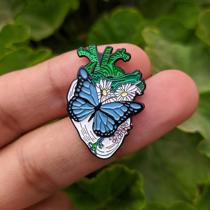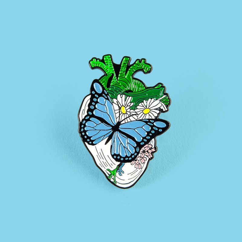Destaca, viste con estilo. Este pin muestra un corazón con motivos de una mariposa y margaritas 🦋