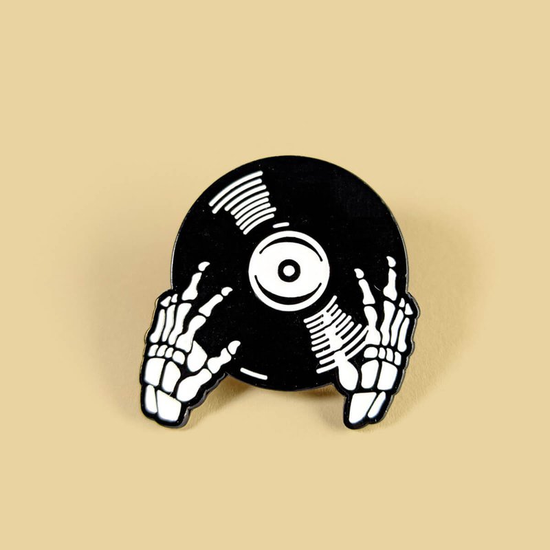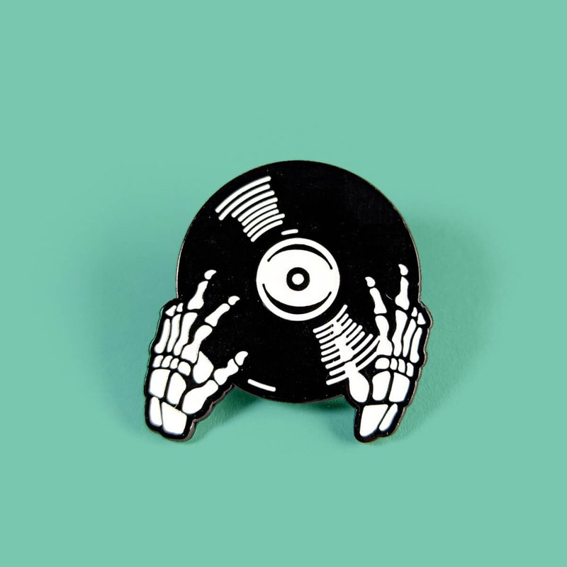 Pin de aleación de zinc con forma de un disco de vinilo siendo manipulado por dos manos (o sus huesos 🦴).