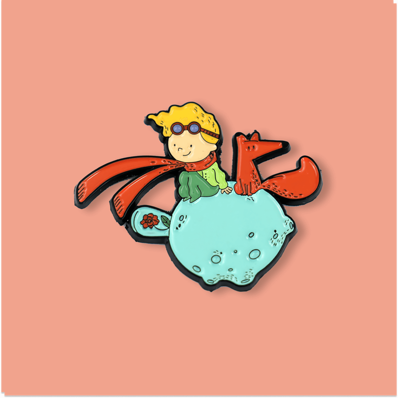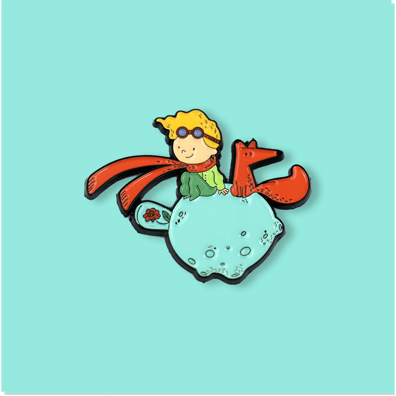 El principito, un clásico de la literatura infantil retratado en este pin junto a la rosa y a su amigo el zorro.