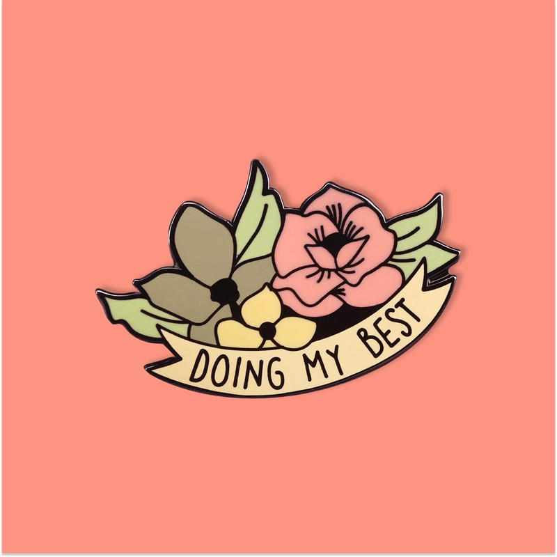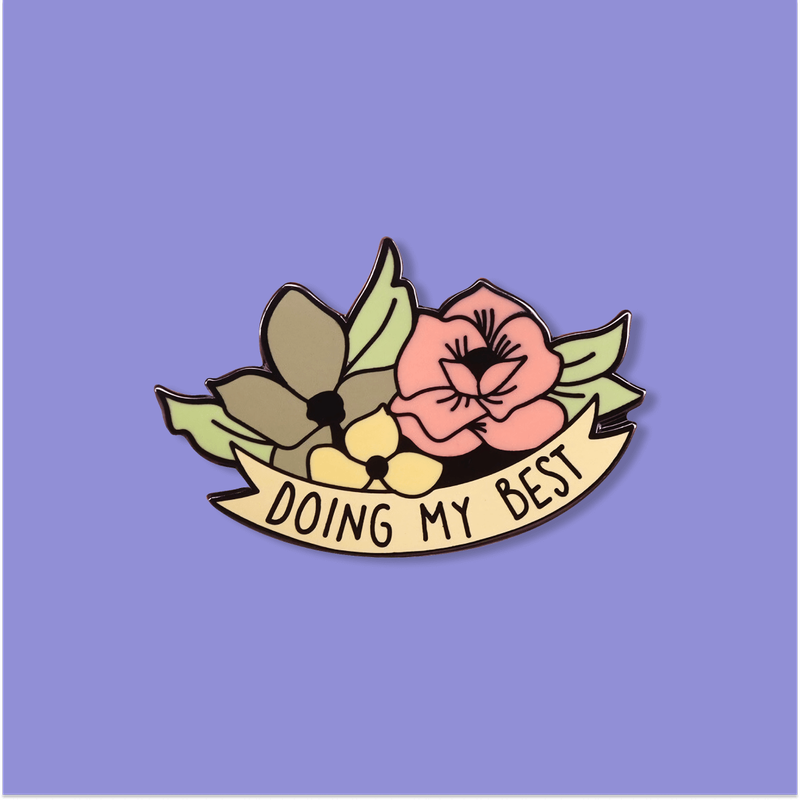 Pin metálico con motivos de unas flores y una cinta que dice: "Doing my best" 🎀 🌸