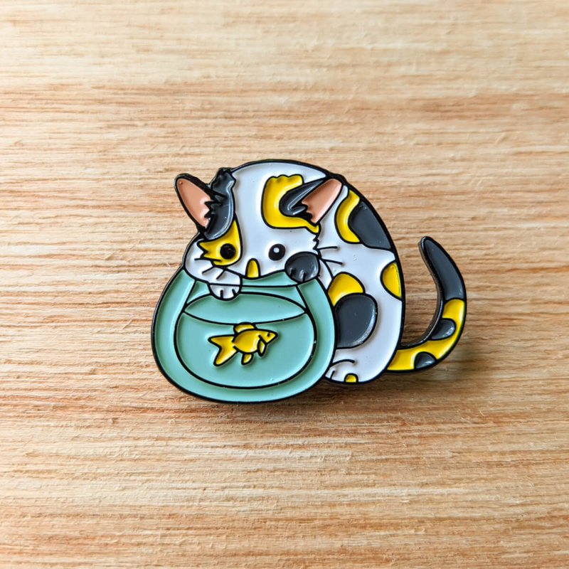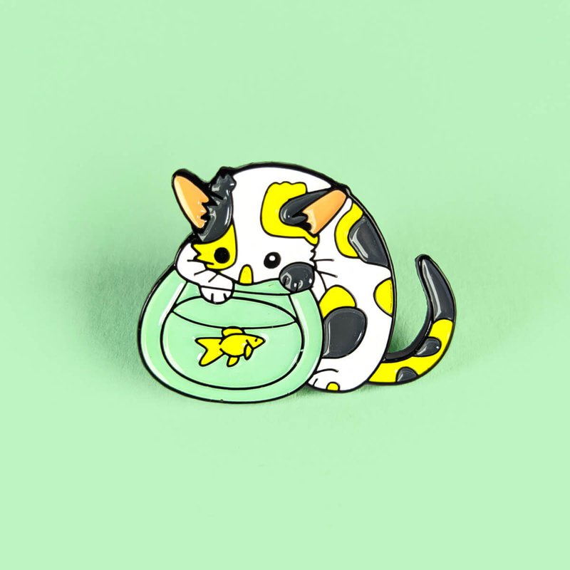 Lleva este pin que muestra a un michi jugando con su pequeño amigo ¿O su próximo almuerzo?.