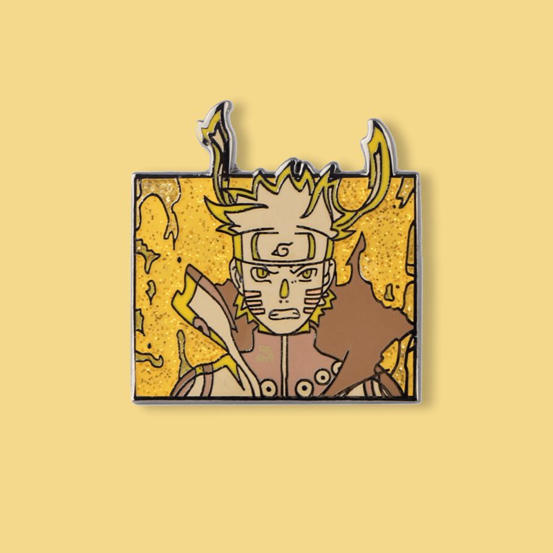 En esta ocasión tenemos un pin dorado y escarchado de Naruto Shippuden, rodeado posiblemente del chakra del zorro de las 9 colas.